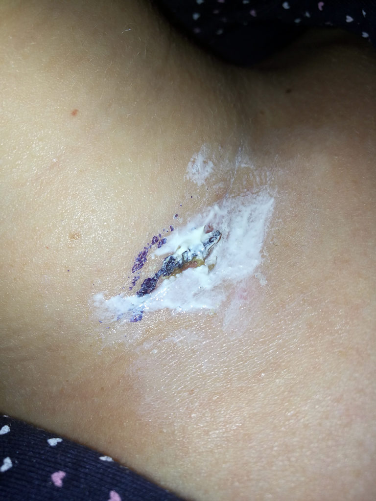 November 6-án volt a műtét, 9-én engedtek ki a kórházból és 3 nap múlva vettem le először a ragasztást a sebemről. Erről a professzor úr asszisztensét kérdeztem meg, hiszen vele beszéltem hétfőn és már akkor fenn állt a lehetősége annak, hogy azon a héten nem kell mennem ellenőrzésre. Kedd estefelé már furdalt a kíváncsiság, hogy milyen látvány is fog fogadni, ha leveszem a ragasztást, mivel bele volt kicsit ragadva féltem, hogy nehogy felszakítsam a sebet és kivérezzen. Először óvatosan körben a ragasztót leválasztottam a nyakamról és már csak az a rész miatt maradta rajta a sebemen, amely bele volt ragadva. Óvatosan leszedtem és amint megláttam a sebet egy kicsit megörültem, mert tényleg egy kis vágás fogadott. Persze ekkor még rajta volt a var és a szép kékes-lilás festék is, ami miatt még nem lehetett teljesen látni, hogy pontosan mekkora is. Ami először aggasztott, hogy ahogy leszedtem a ragasztást kicsit úgy tűnt, mintha gennyes lenne a seb, de egy kis idő múlva ez beszáradt, csak az miatt tűnt annak, mert kicsit megtéptem a sebet. Erről láthattok is egy képet, ami szerintem pár perccel az után készült, miután levettem a ragasztást.