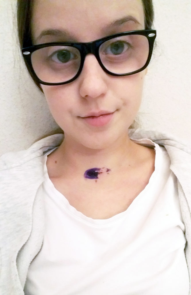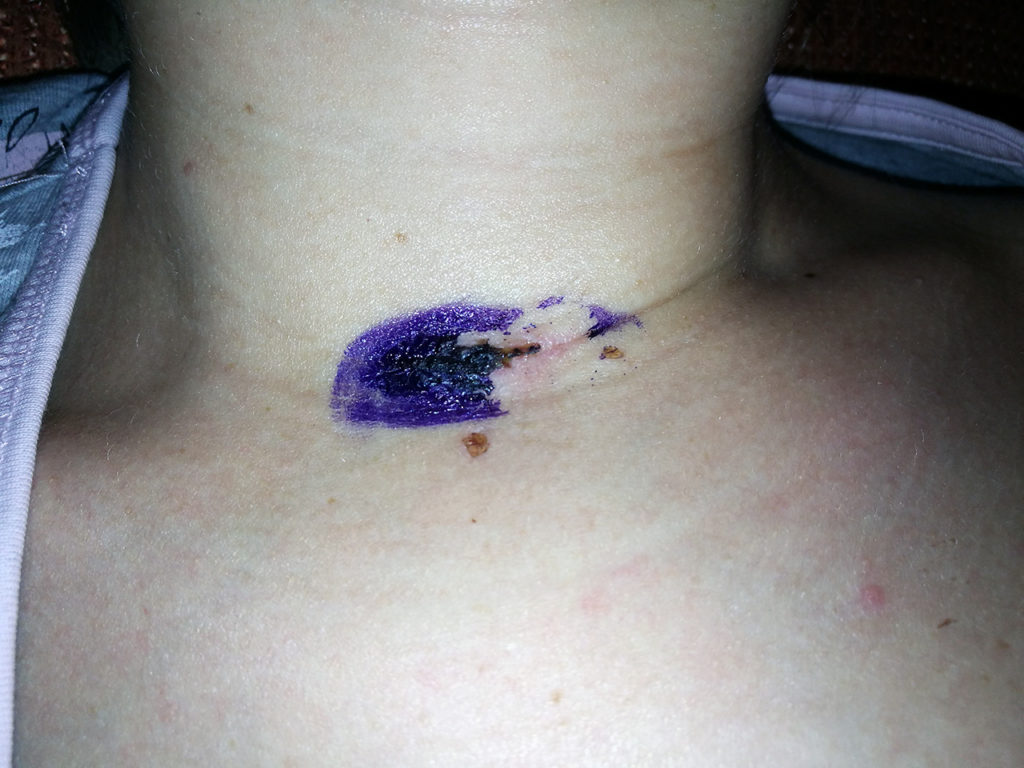November 6-án volt a műtét, 9-én engedtek ki a kórházból és 3 nap múlva vettem le először a ragasztást a sebemről. Erről a professzor úr asszisztensét kérdeztem meg, hiszen vele beszéltem hétfőn és már akkor fenn állt a lehetősége annak, hogy azon a héten nem kell mennem ellenőrzésre. Kedd estefelé már furdalt a kíváncsiság, hogy milyen látvány is fog fogadni, ha leveszem a ragasztást, mivel bele volt kicsit ragadva féltem, hogy nehogy felszakítsam a sebet és kivérezzen. Először óvatosan körben a ragasztót leválasztottam a nyakamról és már csak az a rész miatt maradta rajta a sebemen, amely bele volt ragadva. Óvatosan leszedtem és amint megláttam a sebet egy kicsit megörültem, mert tényleg egy kis vágás fogadott. Persze ekkor még rajta volt a var és a szép kékes-lilás festék is, ami miatt még nem lehetett teljesen látni, hogy pontosan mekkora is. Ami először aggasztott, hogy ahogy leszedtem a ragasztást kicsit úgy tűnt, mintha gennyes lenne a seb, de egy kis idő múlva ez beszáradt, csak az miatt tűnt annak, mert kicsit megtéptem a sebet. Erről láthattok is egy képet, ami szerintem pár perccel az után készült, miután levettem a ragasztást.